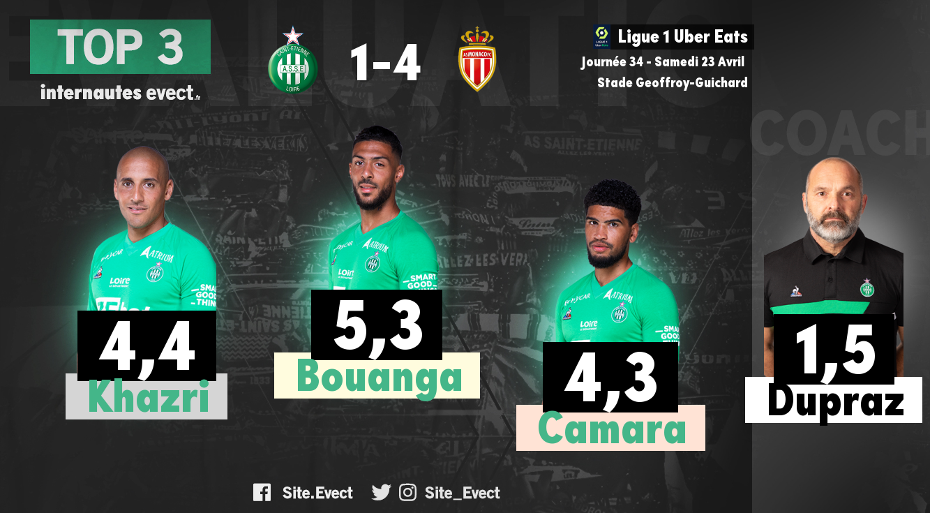 Défaits face à Monaco, les Verts ne récoltent pas un très bon bulletin de note pour cette 34ème journée de L1. Auteur d'un nouveau CSC, Kolodziejczak prend 2 dans les colonnes du Progrès et de L'Équipe, 0,5 sur Evect. Le joueur le mieux noté est Denis Bouanga dans les trois médias. C'est le seul joueur à obtenir la moyenne sur Evect.