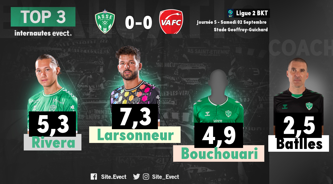 La seconde mi-temps de cet #ASSEVAFC aura marqué une nouvelle rupture entre le jeu proposé par cette équipe et ses supporters. Sans surprise, les notes ne sont pas bonnes. Ils ne sont que deux à obtenir la moyenne du côté des supporters : Larsonneur (7,3) et Rivera (5,3). Deux joueurs qui obtiennent les meilleures notes dans la presse avec 7 pour Larsonneur et 6 pour Rivera.
