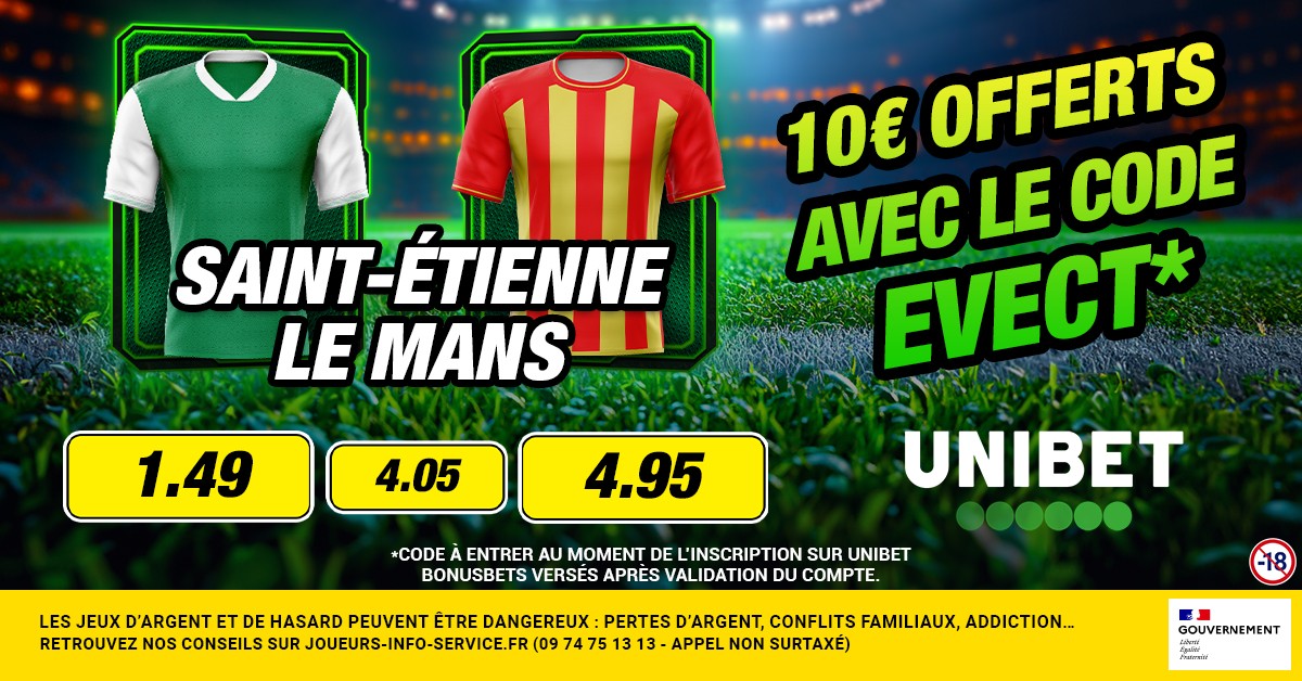 Saint-Étienne reçoit Le Mans FC pour le compte de la dixième journée de championnat de Ligue 2. Découvrez les cotes de la rencontre et le pari de la rédaction pour rafler la mise. Profitez d'un bonus allant jusqu'à 100€ chez notre partenaire Unibet, entrez le code Evect au moment de votre inscription et bénéficiez de 10€ offerts.