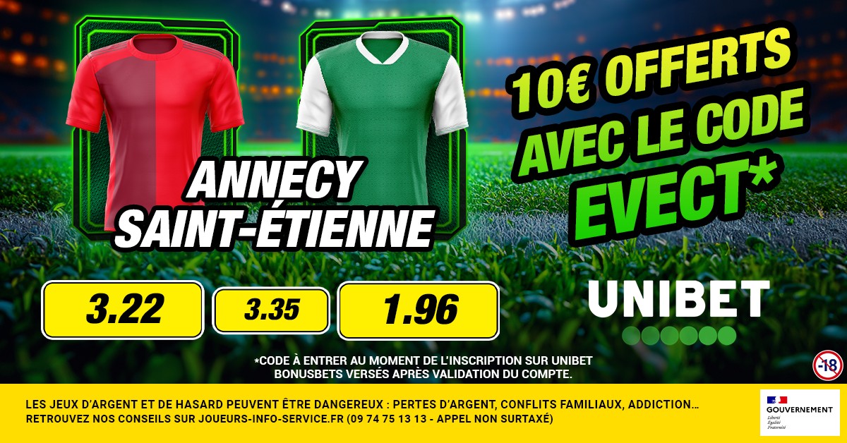Saint-Étienne se déplace à Annecy pour le compte de la onzieme journée de championnat de Ligue 2. Découvrez les cotes de la rencontre et le pari de la rédaction pour rafler la mise. Profitez d'un bonus allant jusqu'à 100€ chez notre partenaire Unibet, entrez le code Evect au moment de votre inscription et bénéficiez de 10€ offerts.