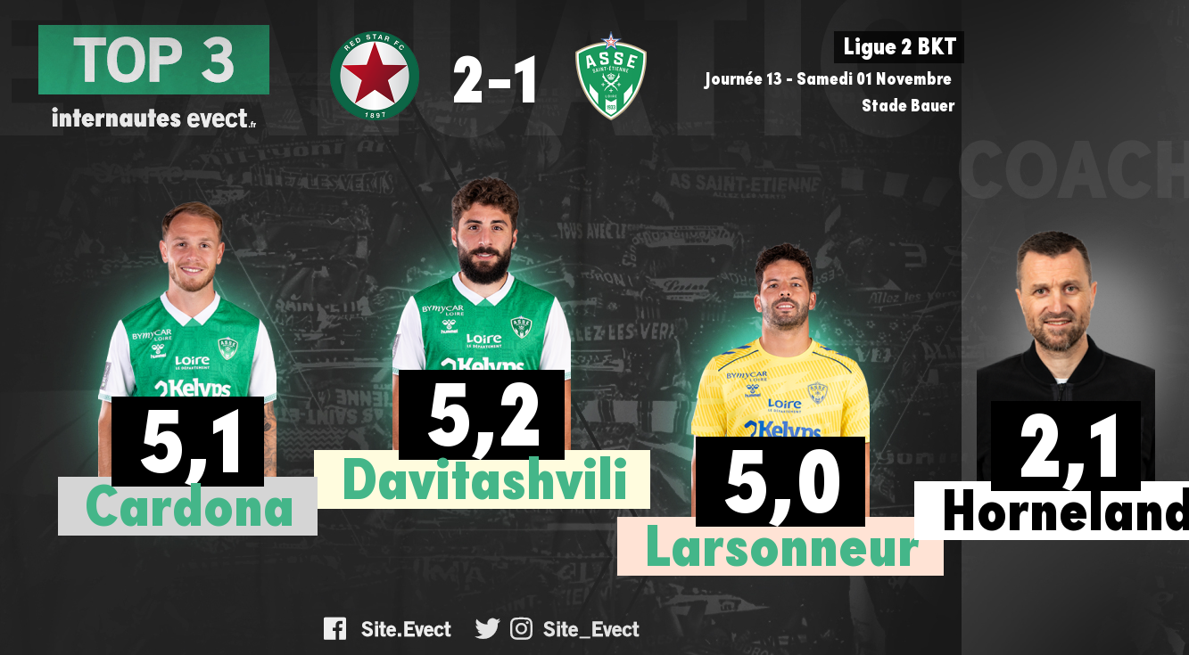 Après la parenthèse enchantée de Pau, les notes reviennent à des standards plus conformes aux performances actuelles de l’ASSE. Comme face à Annecy le week-end dernier, les mauvaises évaluations pleuvent. Ils ne sont que trois chez les supporters à obtenir la moyenne sur cette rencontre contre le Red Star : Davitashvili (5,2), Cardona (5,1) et Larsonneur (5). Constat similaire dans la presse pour ces trois joueurs.