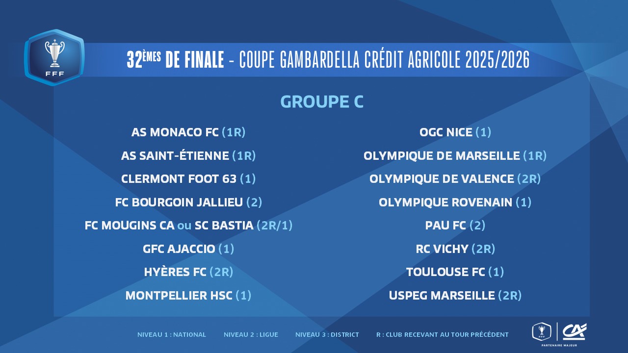 - Niveau 1 : Monaco, Clermont Foot, Bastia (ou Mougins), GFC Ajaccio, Montpellier, Nice, Marseille, Olympique Rovenain, Toulouse