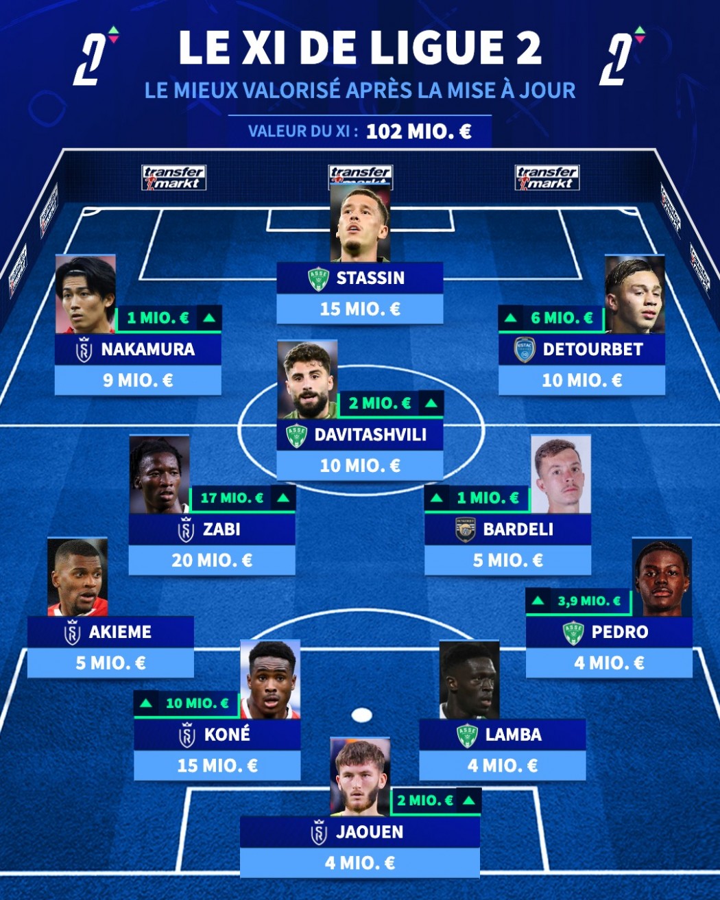 Le club champenois place son gardien, Jaouen (4M€), son défenseur central Koné (15M€), son latéral gauche Akieme (5M€), son milieu Zabi qui est le joueur le mieux valorisé dans l'histoire de la Ligue 2 (20M€) et enfin son ailier Nakamura (9M€). L'USL Dunkerque vient se glisser dans cette équipe avec Enzo Bardeli (5M€). Idem pour l'ESTAC qui place un joueur en la personne de Mathys Detourbet (10M€).
