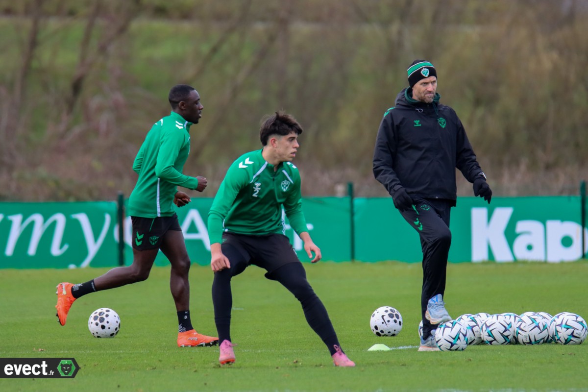 Après un petit échauffement à base de « toros », les Verts se sont affrontés dans des deux contre un puis trois contre deux. Une opposition sur espace réduit a ensuite pris place. Pour terminer, Stojkovic, Gadegbeku et El Jamali ont travaillé devant le but sur des combinaisons avec centres devant la cage.