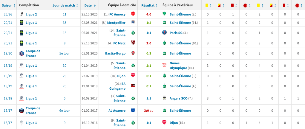 - 15 cartons jaunes pour l'ASSE ; 20 pour ses adversaires