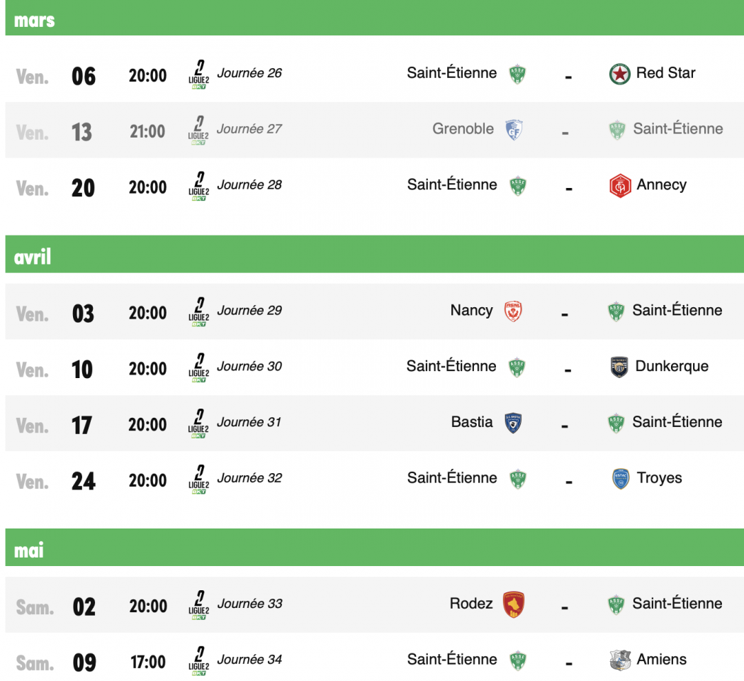 Le mois de Mars sera le plus léger de l’année avec trois matchs au programme face au Red Star, Grenoble et enfin Annecy à domicile le week-end du 20. Trois équipes contre lesquelles les Verts ont laissé pas mal de points en route sur la phase aller, s’inclinant par deux fois à l’extérieur sur les pelouses du Red Star (2-1) et d’Annecy (4-0), faisant nul à la maison contre le GF38 (1-1). Avril sera le dernier gros bloc de rencontres de la saison avec quatre matchs prévus face à Nancy, Dunkerque, Bastia et enfin Troyes. Deux rencontres seulement en mai, à l’extérieur d’abord face à Rodez lors de la J33 puis pour, espérons, la dernière sortie des Verts de la saison à la maison, contre Amiens en clôture du championnat le 9 mai avec une montée à fêter.