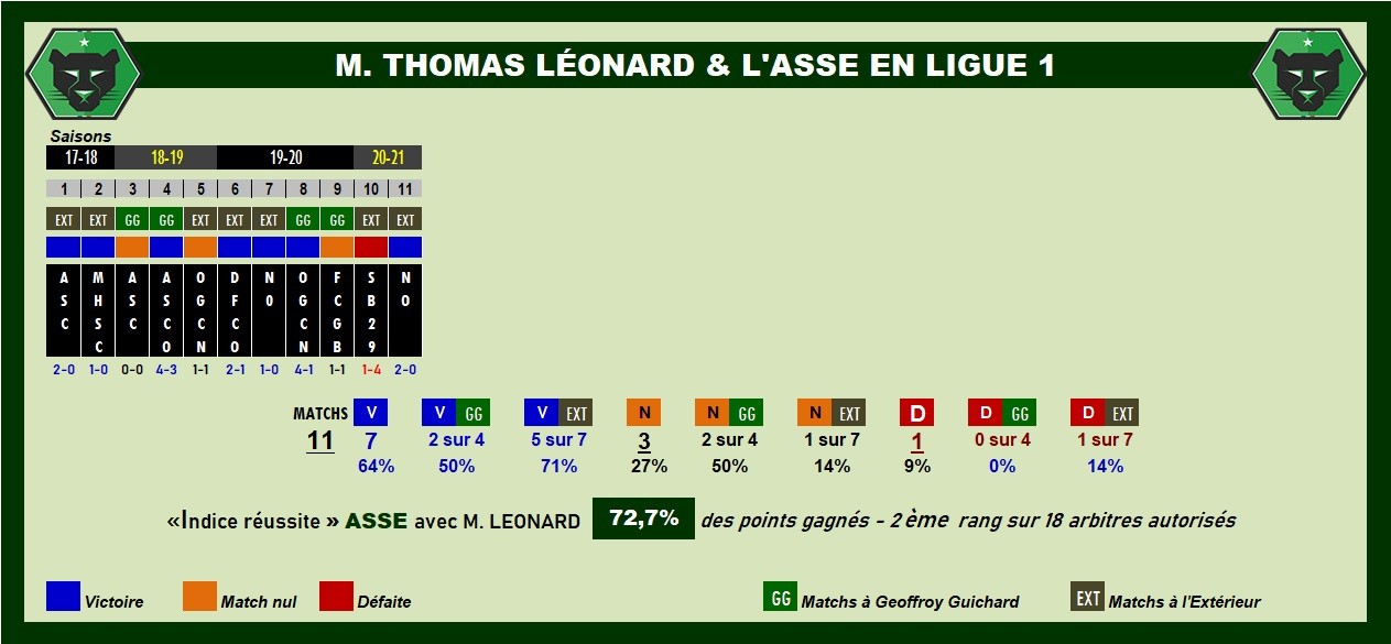 La saison dernière, M. Leonard n’a fait que 13 apparitions en Ligue 1, il a distribué 53 jaunes (4/match) et 2 rouges. L’ASSE n’avait jamais perdu avec lui au sifflet avant la déroute subie la saison dernière à Brest. Jusqu’à ce jour, les Verts ont récolté près de 73% des points mis en jeu sous son autorité. Seul M. Stinat réussit mieux aux Stéphanois, mais avec 3 matchs arbitrés seulement.
