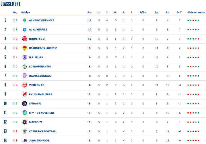 Réserve (National 3) : C'est la performance du week-end qu'ont signé les joueurs de Sylvain Gibert. Réduits à dix en première mi-temps après l'expulsion de Depalle, les Verts sont tout de même parvenus à arracher la victoire en seconde mi-temps grâce à un but inscrit par Cheikh après l'heure de jeu. Un succès qui permet aux Verts de prendre la tête de leur poule de National 3 après cinq journées.