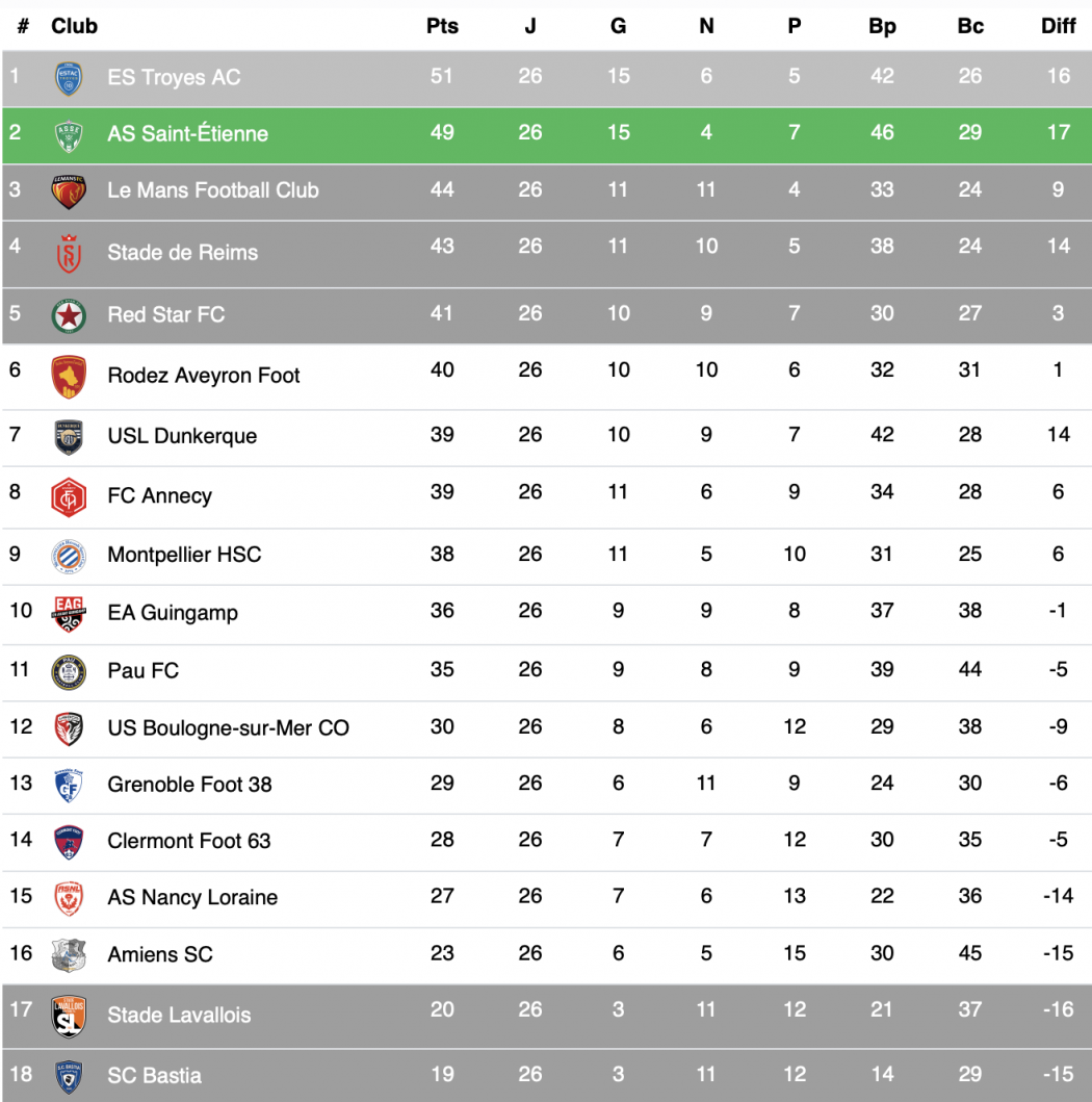 Sur le papier, Troyens et Stéphanois ont fait une grande partie du travail dans la course à la montée, mais la Ligue 2 a souvent joué des tours aux équipes de tête par le passé. Solides leaders, les joueurs de l’ESTAC possèdent deux points d’avance sur les Stéphanois et sept sur Le Mans, troisième. Les Aubois se déplaceront à cinq reprises dans cette fin de saison, avec notamment un match à Geoffroy-Guichard contre l’ASSE lors de la 32ème journée de championnat.