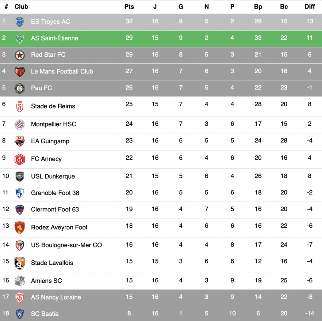 Le classement après la 16ème journée de Ligue 2 :