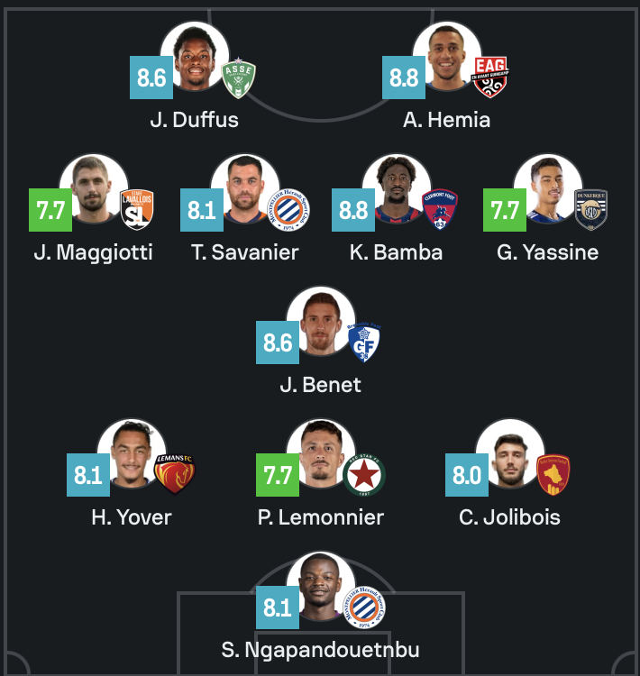 Sans trop de suspense, c’est Joshua Duffus qui figure dans l’équipe type de la 14ème journée de Ligue 2 du site spécialisé Sofascore. Avec un but et deux passes décisives, l’attaquant anglais occupe la pointe de l’attaque aux côtés d’Hemia de l’En Avant Guingamp.