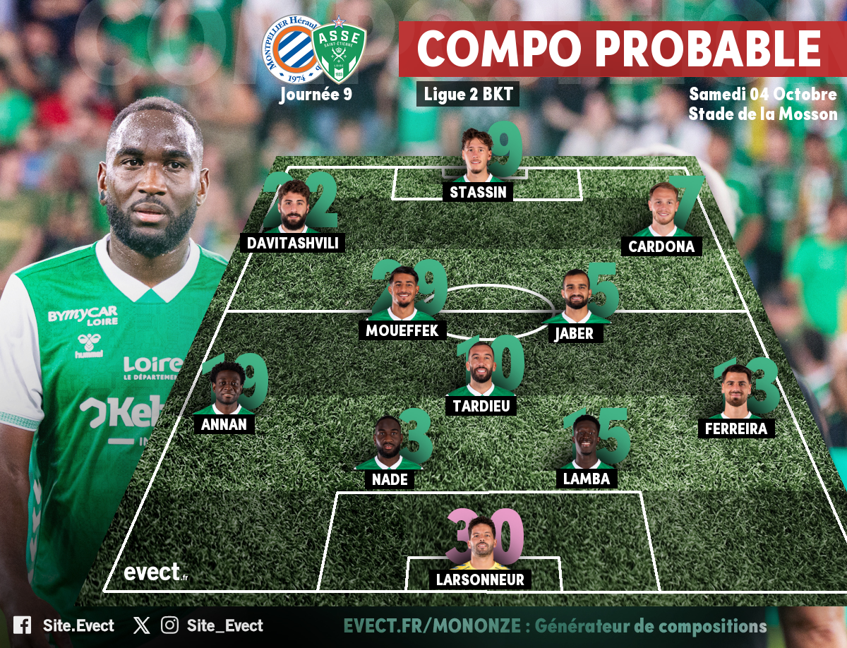 L’AS Saint-Étienne se déplace ce samedi soir sur la pelouse de Montpellier pour affronter le MHSC dans le cadre de la neuvième journée du championnat de France de Ligue 2. Découvrez la composition probable pour cette rencontre.