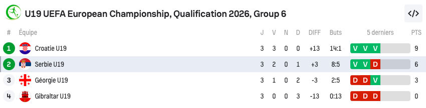 - Le 12 novembre à 13h45 : Serbie U19 4-0 Gibraltar U19