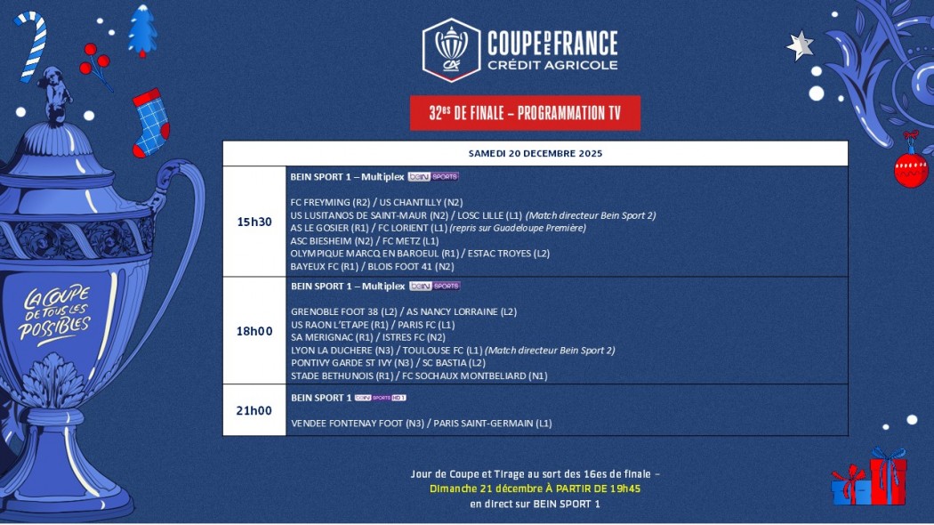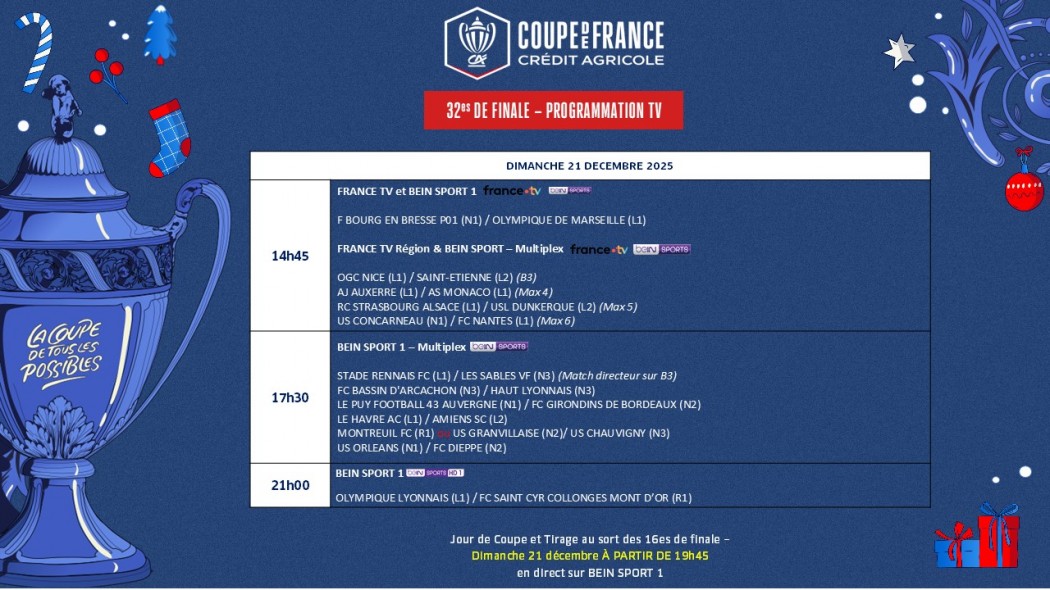 Il faudra donc se rabattre sur la télévision pour regarder cette rencontre. Il y aura deux diffuseurs pour ce match de Coupe de France entre l'OGC Nice et l'AS Saint-Étienne ce dimanche à 14h45. France Télévision (Région) et beIN Sports (3) diffuseront cette rencontre en intégralité. France TV proposera également un multiplex des rencontres se tenant à 14h45 avec notamment au programme le match entre Bourg-en-Bresse et l'OM, Auxerre et Monaco, Strasbourg et Dunkerque et Concarneau et Nantes.