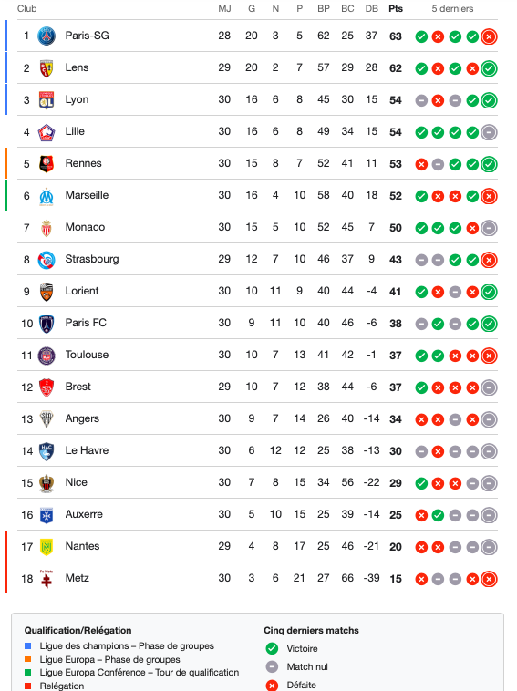 Le classement provisoire de Ligue 1 :
