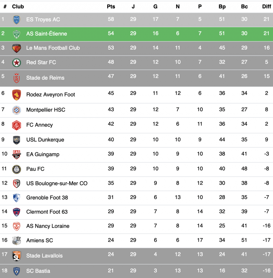 Statu-quo chez les leaders puisque Troyes après son match nul face à Montpellier (2-2) garde ses quatre points d’avance sur l’ASSE, tenue en échec à Nancy (1-1). Même chose dans la course aux barrages avec les résultats du Red Star face à Laval (0-0) et de Reims contre Boulogne (0-0). Grâce à son large succès sur Pau (4-0), Le Mans fait la grosse opération de la journée et compte désormais 53 points, un de moins que l’AS Saint-Étienne. Les joueurs de la Sarthe pointent à cinq longueurs de l’ESTAC.