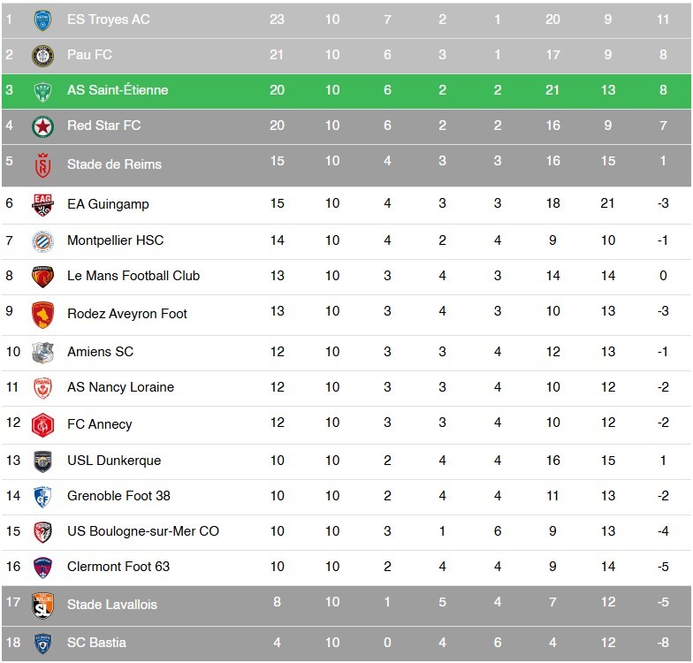 Amiens fait la bonne opération et remonte à la 10e place. L'ASSE clôture cette dixième journée à la troisième place du championnat, ex-aequo avec le Red Star FC et à trois points du leader troyen.
