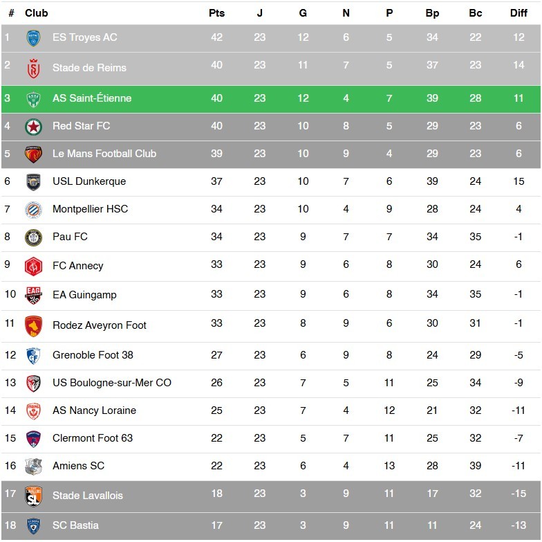 Avec les rencontres du jour, Saint-Étienne peut ainsi perdre deux places et glisser de la troisième à la cinquième. Pour que ce scénario se concrétise, il faudra que l'USL Dunkerque s'impose à domicile contre la lanterne rouge du championnat, le Sporting Club de Bastia. Dans le même temps, le Red Star FC devra s'imposer au Parc des Sports d'Annecy, face à une formation particulièrement en forme en ce début d'année. Au programme également, le déplacement de Montpellier à Rodez, la réception de Clermont par Boulogne-sur-Mer et enfin le duel de bas de tableau entre Nancy et Grenoble.