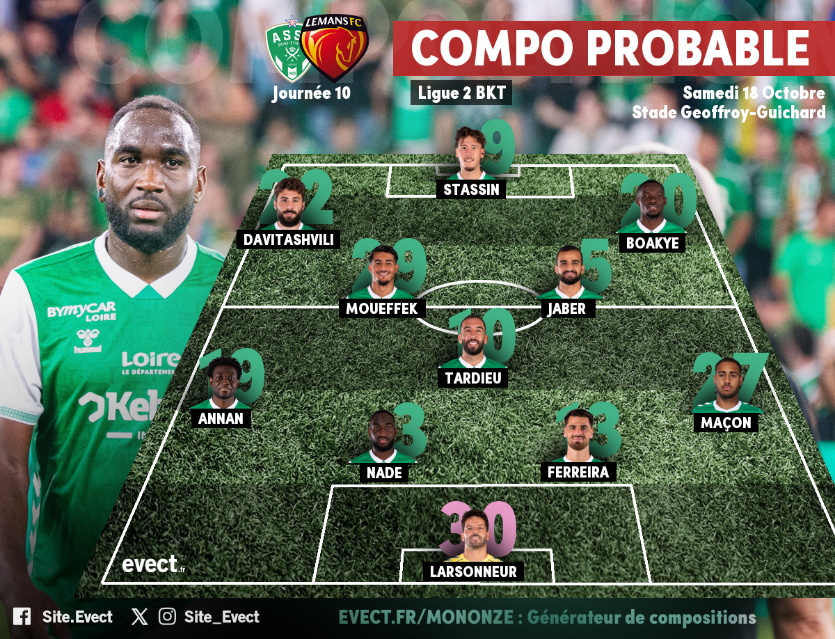 L’AS Saint-Étienne accueille Le Mans ce samedi soir 20h au stade Geoffroy-Guichard dans le cadre de la 10ème journée du championnat de France de Ligue 2. Découvrez la composition probable des Verts.