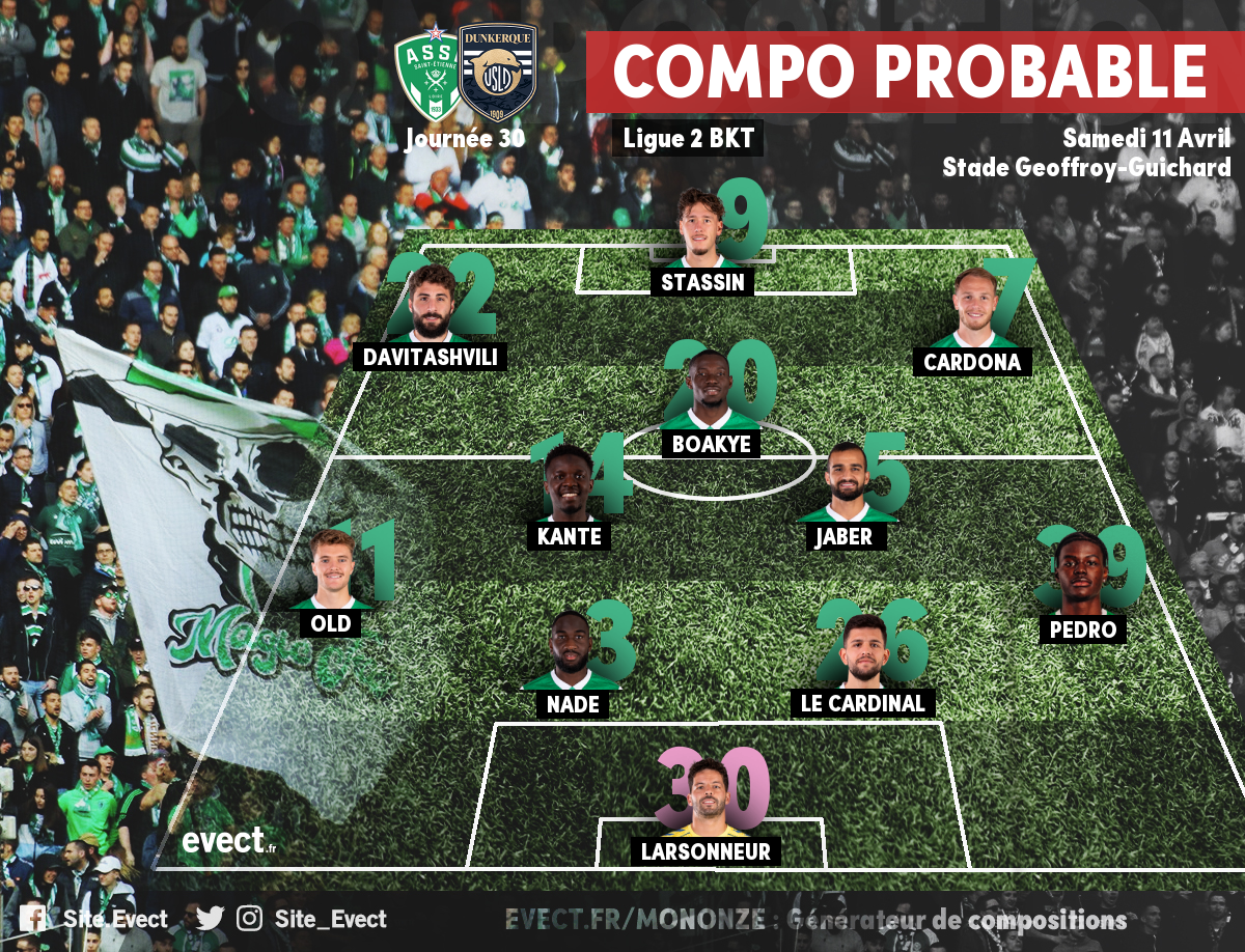 Ce samedi à 20h00, l'AS Saint-Étienne reçoit l'USL Dunkerque au stade Geoffroy-Guichard, dans le cadre de la 30e journée du Championnat de France de Ligue 2.