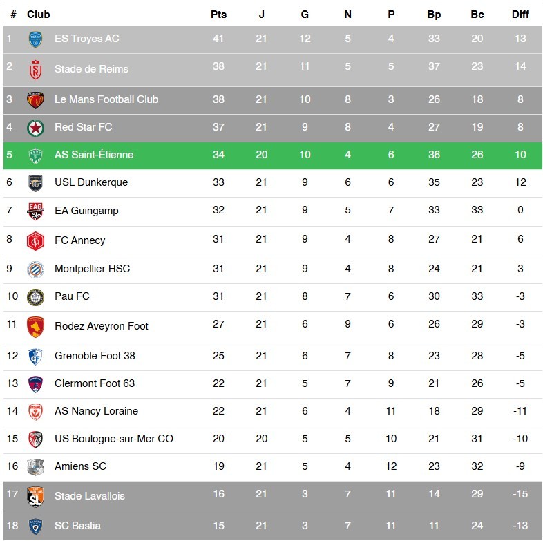 Le classement de la Ligue 2 :