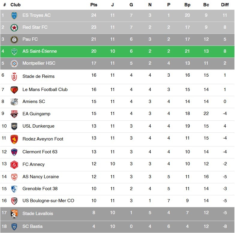 Le classement avant Annecy - Saint-Étienne de la Ligue 2 :