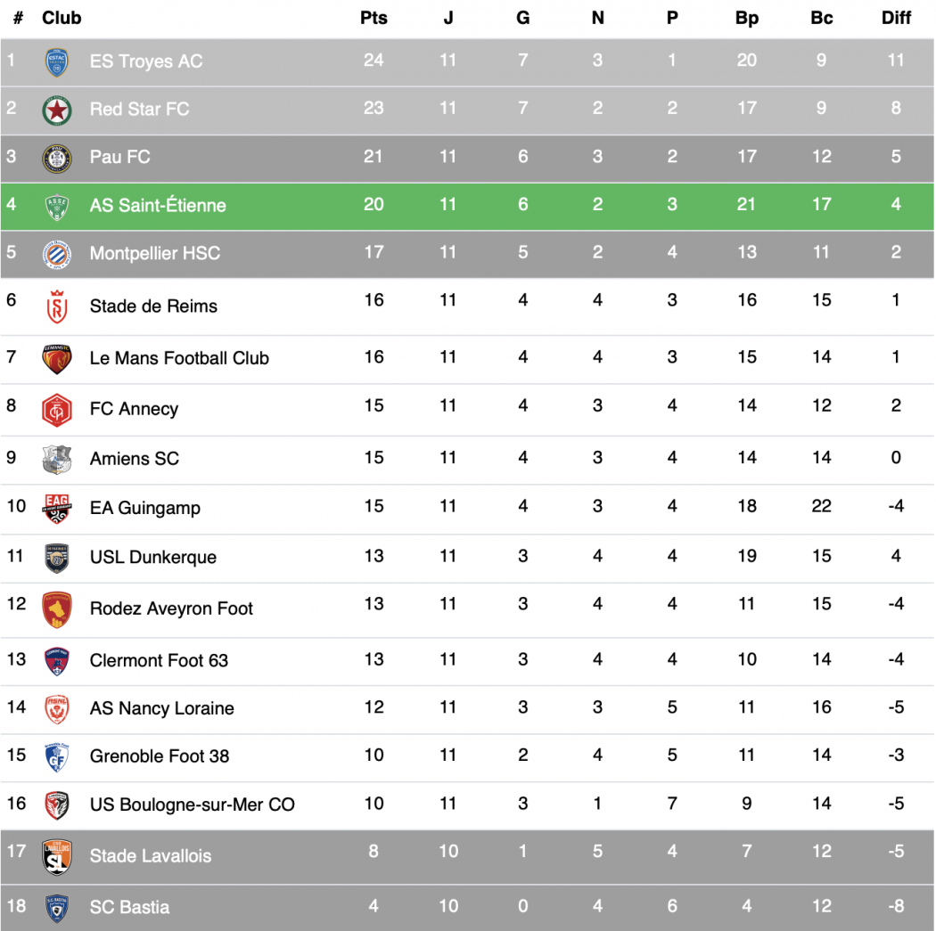 Le classement après la 11e journée de Ligue 2 :