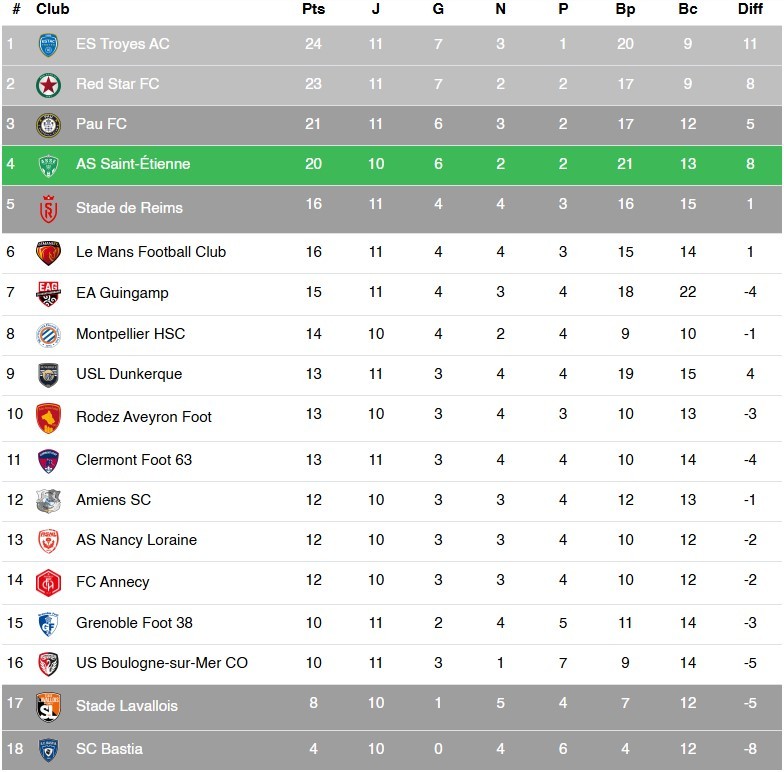 Prochain adversaire des Verts et deuxième du championnat, le Pau Football Club recevait de son côté l'USL Dunkerque, un match qui a tourné à l'avantage des Dunkerquois qui se sont largement imposés 3-0 grâce notamment à un doublé d'Enzo Bardeli. Bourreau des Verts samedi dernier, Le Mans affrontait un autre promu, Boulogne-sur-Mer et a une nouvelle fois fait la différence en fin de match pour s'imposer 1-0. Enfin, Guingamp s'est incliné à domicile face à Clermont (0-1).