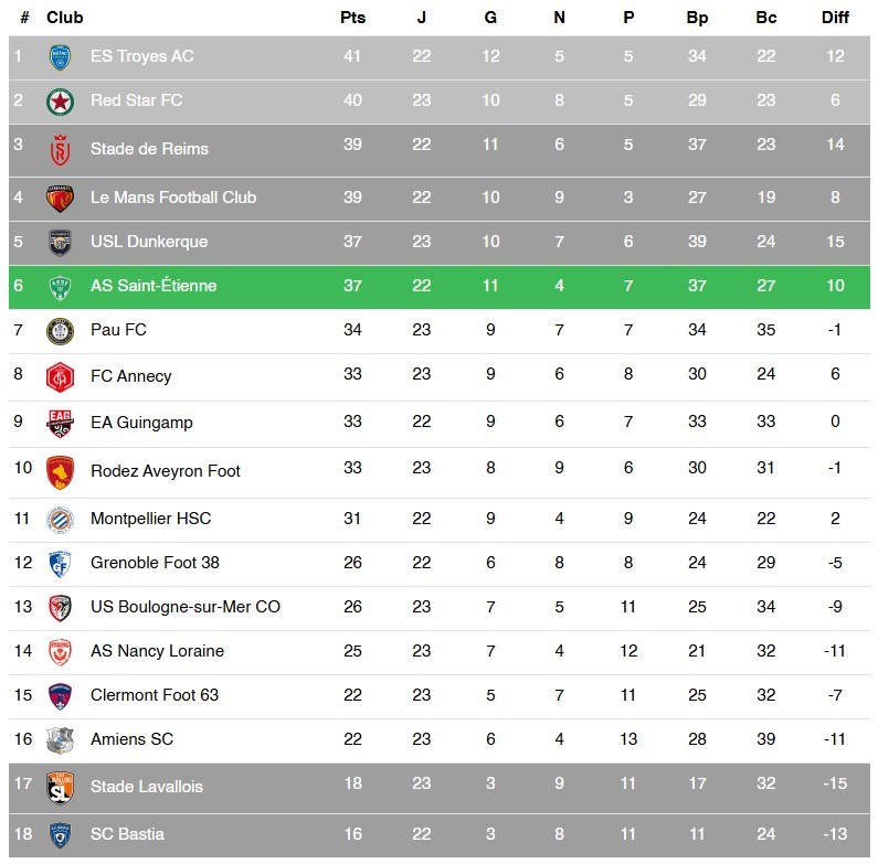 Ce vendredi soir, les yeux des Stéphanois étaient rivés du côté de Bauer, où le Red Star FC pouvait faire la bonne opération en attendant la suite de la journée. Les Audoniens se sont relancés en s'imposant 2-1 contre Nancy. Rodez continue sa remontée avec son succès sur le terrain de Clermont et Dunkerque passe devant l'ASSE qui sort du top 5 en attendant d'affronter Guingamp demain.