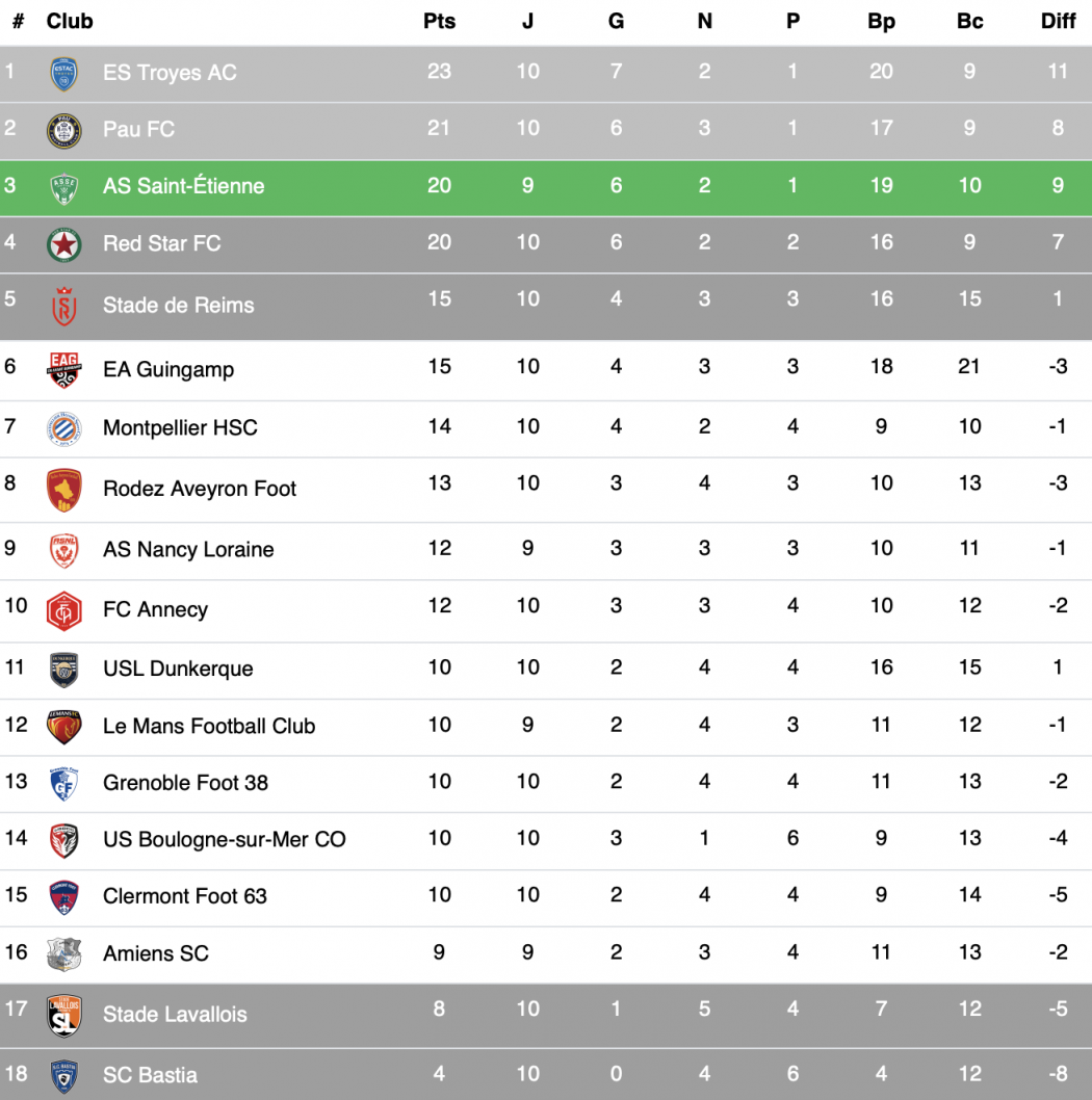 Dans la seconde rencontre du jour entre Laval et le Red Star, c’est à la dernière seconde du match que Damien Durand offre un succès étriqué aux Franciliens (0-1 95’). Au classement, le Red Star reste derrière l’AS Saint-Étienne à la quatrième place avec 20 points, comme les Verts qui ont un meilleur goal average. Belle remontée pour Montpellier désormais septième avec 14 points.