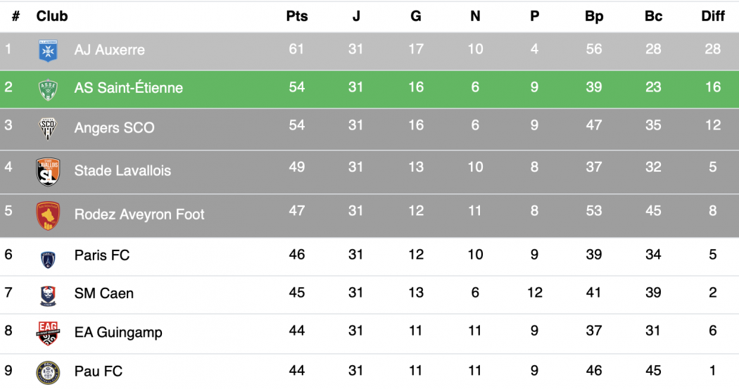 | Auxerre 61pts | ASSE 54pts | Angers 54pts | Laval 49pts | |
