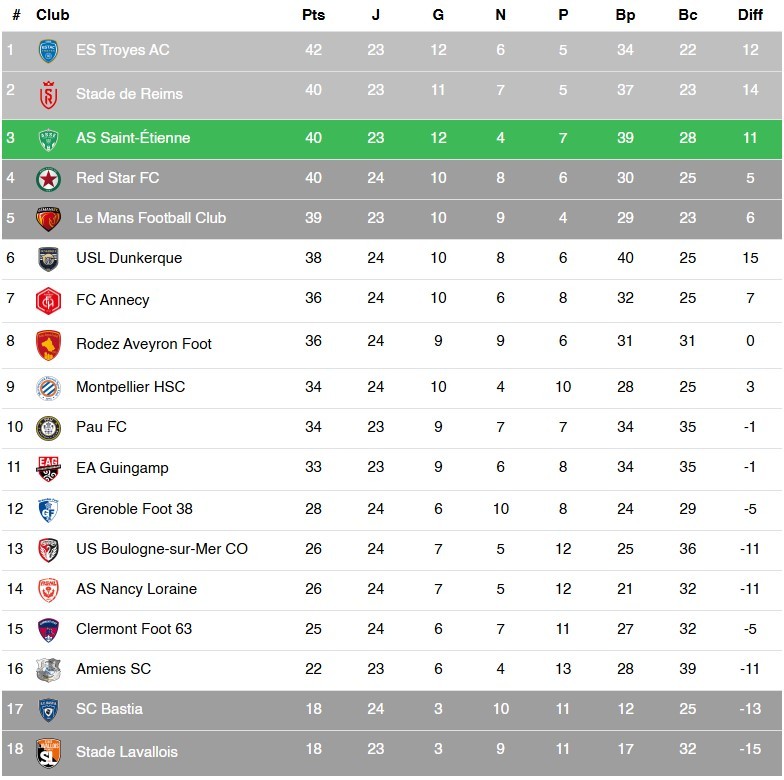 Le classement après le multiplex de la 24e journée de Ligue 2 :