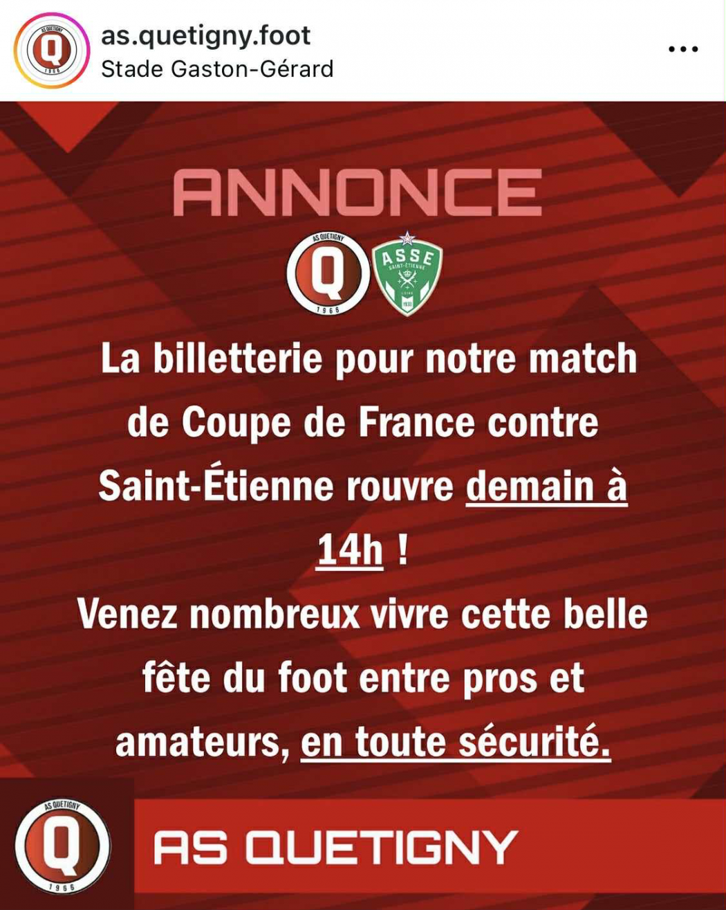 Finalement, le club de Quetigny a annoncé sur ses réseaux sociaux que la billetterie ré-ouvrira ce mardi à 14 heures. Le club de Régional 2 a également précisé que les billets achetés vendredi restaient valables et que l'horaire d'ouverture de cette billetterie sera commun aux Stéphanois et locaux.