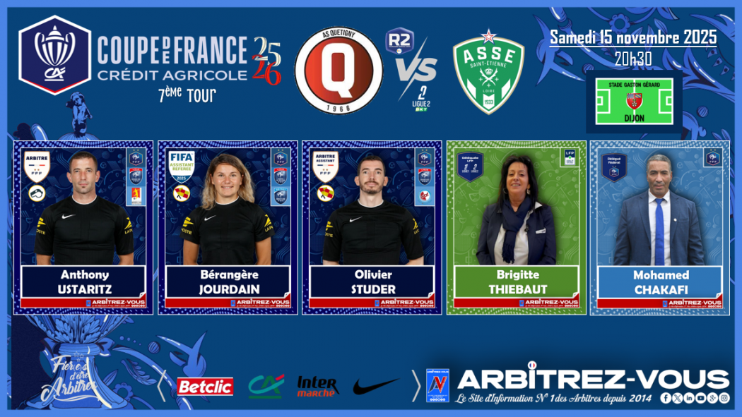 L'arbitre du septième tour de Coupe de France entre Quetigny et l'AS Saint-Étienne a été désigné. Il s'agit d'Anthony Ustaritz. Il sera assisté par Bérangère Jourdain et Olivier Studer.