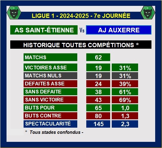 Toutes compétitions et tous stades confondus bilan favorable aux Icaunais mais 61% de rencontres sans défaite pour les Foréziens.