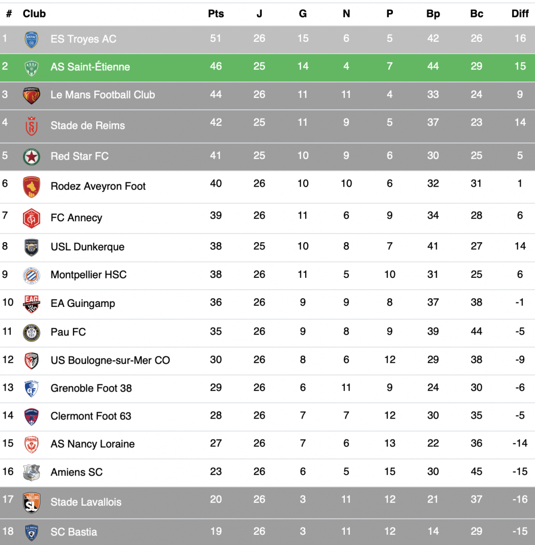 Le classement provisoire en Ligue 2 :