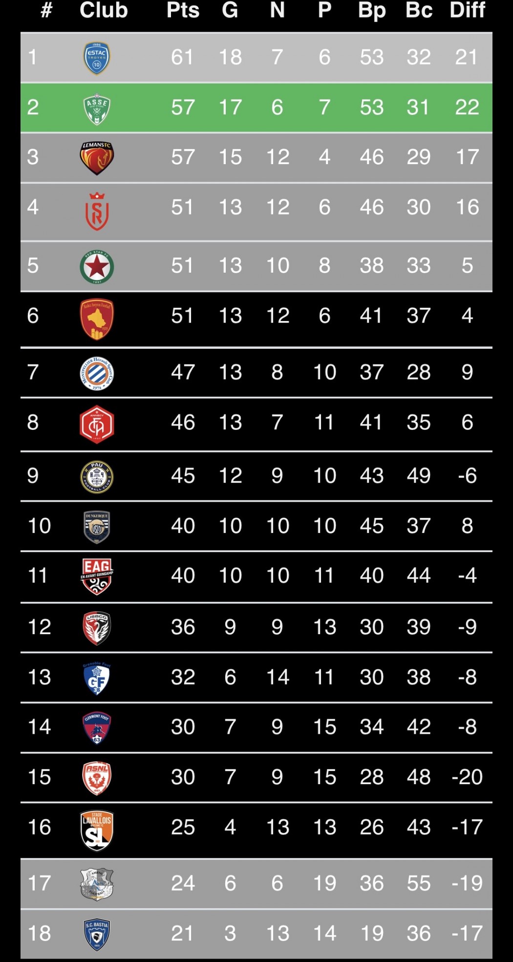 Le classement de Ligue 2 après les matchs de l’après-midi :