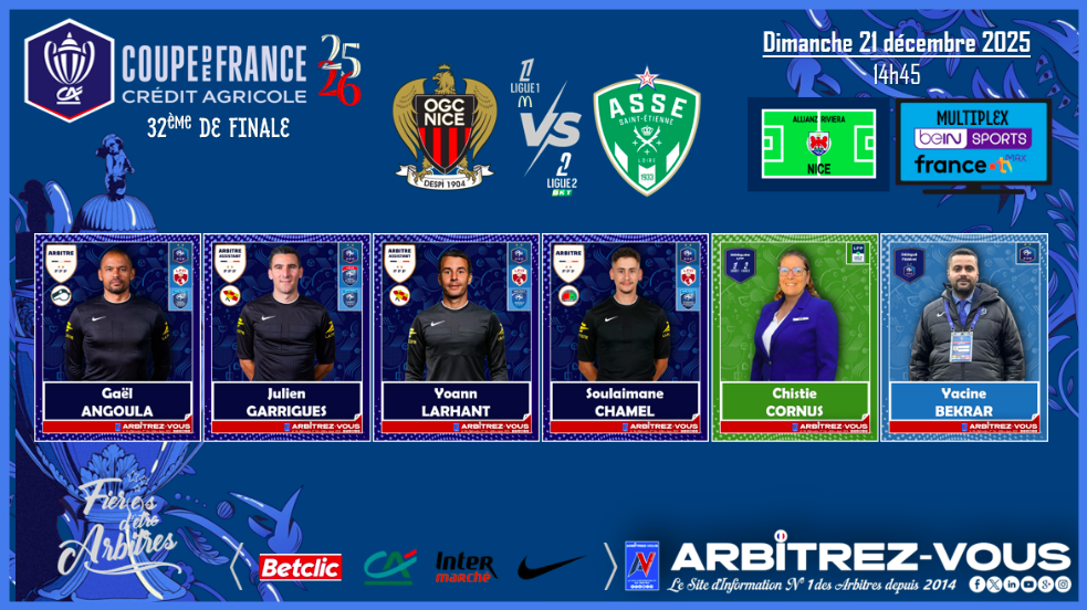 C'est Gaël Angoula qui arbitrera le match entre l'OGC Nice et l'AS Saint-Étienne, ce dimanche à 14h45 pour le compte des 32èmes de finale de la Coupe de France de football.