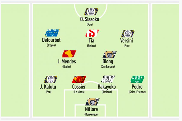Dans cette équipe type des meilleurs jeunes de Ligue 2 (21 ans ou moins), Pedro est accompagné Kalulu de Pau, Bakayoko d'Amiens et Cossier du Mans derrière. C'est Niflore de Dunkerque qui garde les buts. Au milieu de terrain, on retrouve Mendes de Rodez et Diong de Dunkerque. Plus haut, Versini de Pau, Tia de Reims et Detourbet de Troyes sont à l'honneur. Tandis que devant, c'est Sissoko, lui aussi de Pau, qui est aligné.
