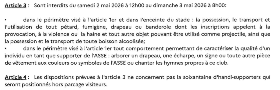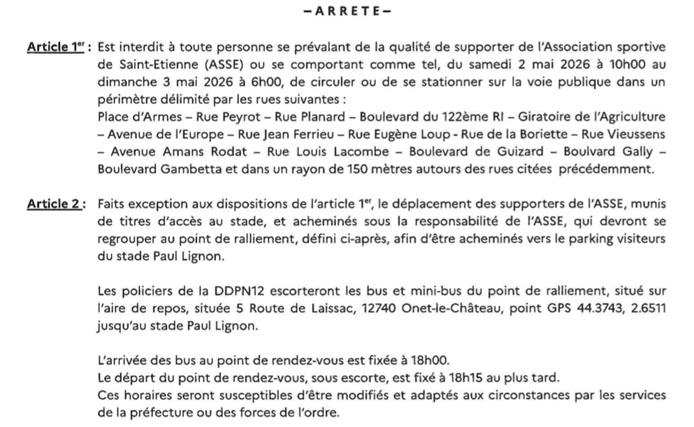 Ainsi, du samedi 2 mai 2026 à 10h00 jusqu'au dimanche 3 mai 2026 à 6h, il est interdit à toute personne se prévalant la qualité de supporter de l'ASSE ou se comportant comme tel, de circuler ou stationner dans un large périmètre à Rodez et ses alentours. Néanmoins, une exception est faite pour les supporters munis de places pour le match et acheminés sous la responsabilité de l'ASSE qui devront se retrouver sur l'aire de repos située 5 route de Laissac à Onet-le-Château pour être escortés par la police jusqu'au stade Paul-Lignon. L'heure de rendez-vous est fixée à 18 heures et le départ vers le stade au plus tard à 18h15.