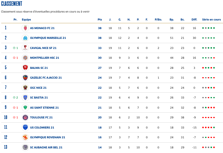 U19 Nationaux : En déplacement sur la pelouse du Cavigal Nice, les U19 de l'AS Saint-Étienne ont manqué l'occasion de se replacer dans la première partie du tableau. Les joueurs de Frédéric Dugand ont cédé une seule fois dans cette rencontre, juste avant le retour aux vestiaires. C'est Darri Tifra qui a inscrit le but niçois à la 43e minute. En seconde mi-temps, les Verts ne sont pas parvenus à recoller au score malgré leurs bonnes intentions et se sont inclinés déjà pour la septième fois cette saison en 18 journées disputées. Au classement, les Verts restent dans la deuxième moitié de tableau.