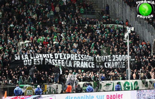 Angers-ASSE: Les supporters stéphanois demandent «où est passée la France de CHIENLIE EUUUH CHARLIE»http://img.20mn.fr/uJQql2taRvuAi21MYZ0feg/648x415_banderole-deployee-samedi-soir-durant-premiere-mi-temps-angers-asse.jpgdéplacement samedi à Angers (0-0), les ultras de l'ASSE ont envoyé un message à la LFP, qui a infligé 25.000 euros d'amende cette semaine au club stéphanois pour les banderoles visant le PSG http://pmcdn.priceminister.com/photo/charlie-hebdo-n-251-du-09-04-1997-cuba-reportage-de-charb-et-wolinski-foot-chirac-contre-la-fuite-des-molles-madelin-la-petite-frappe-qui-monte-1007388469_ML.jpgLa direction de l’ASSE ignore encore les motifs de l’amende